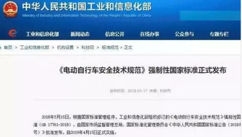 今年的5月17日,由國家市場監(jiān)督管理總局、國家標準化管理委員會批準發(fā)布的、新修訂的《電動自行車安全技術(shù)規(guī)范》出臺,將于2019年4月15日起實施。